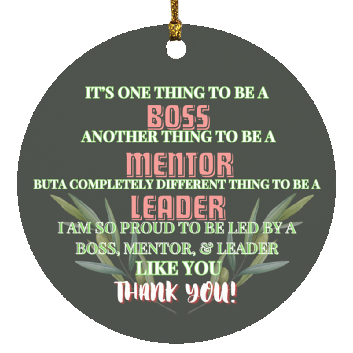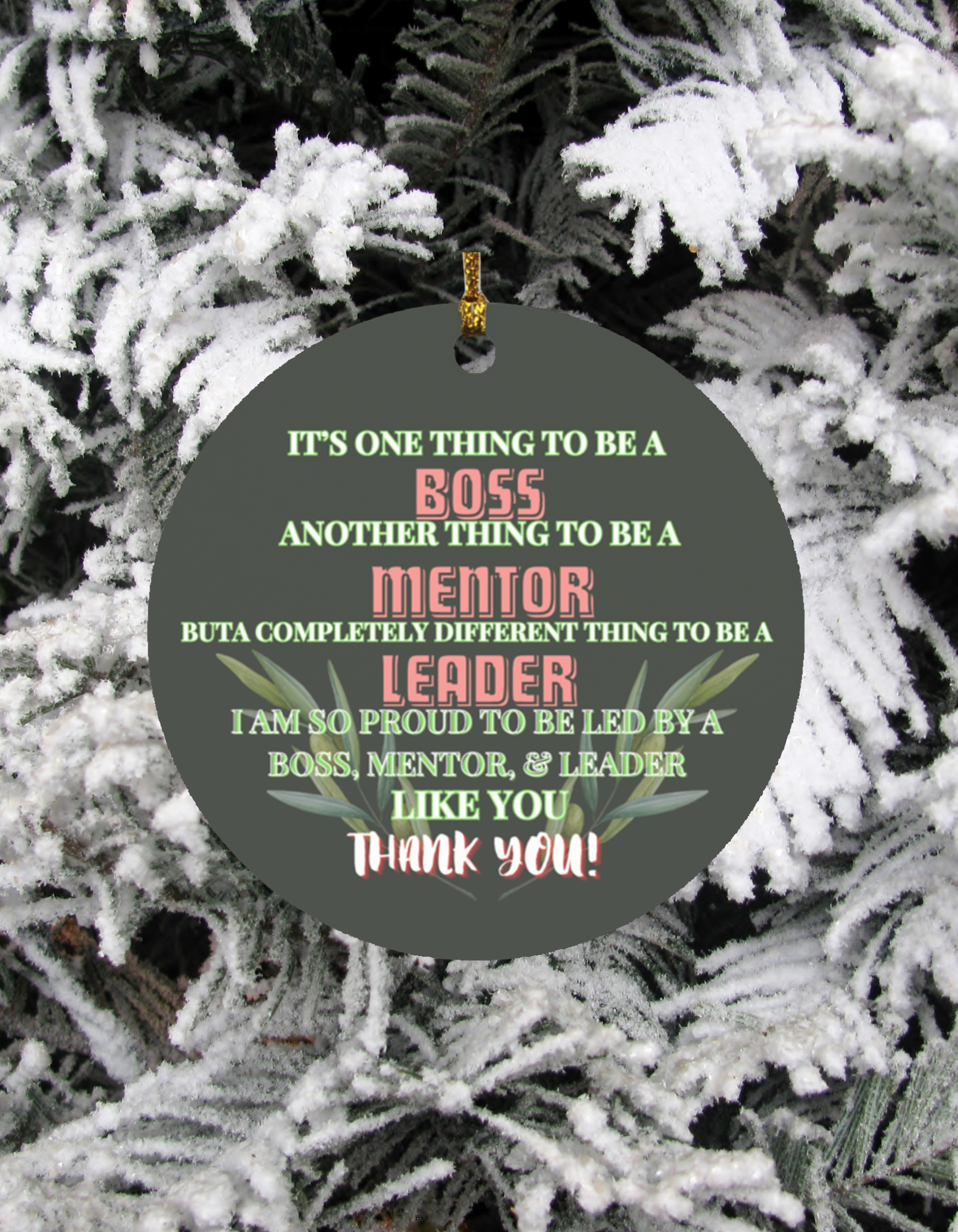 Honor the exceptional leadership that lights your path with our distinguished ornament. In elegant light black with striking red and green text, this circle of gratitude adorned with an olive branch is a token of appreciation for the extraordinary qualities that make a boss, mentor, and leader truly stand out.