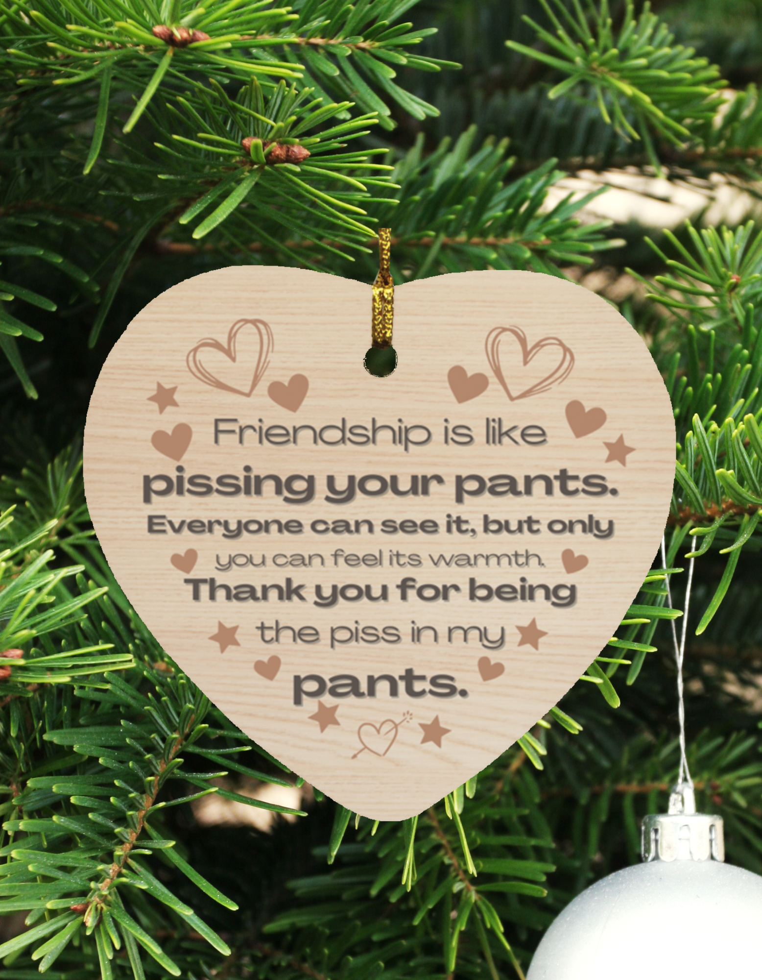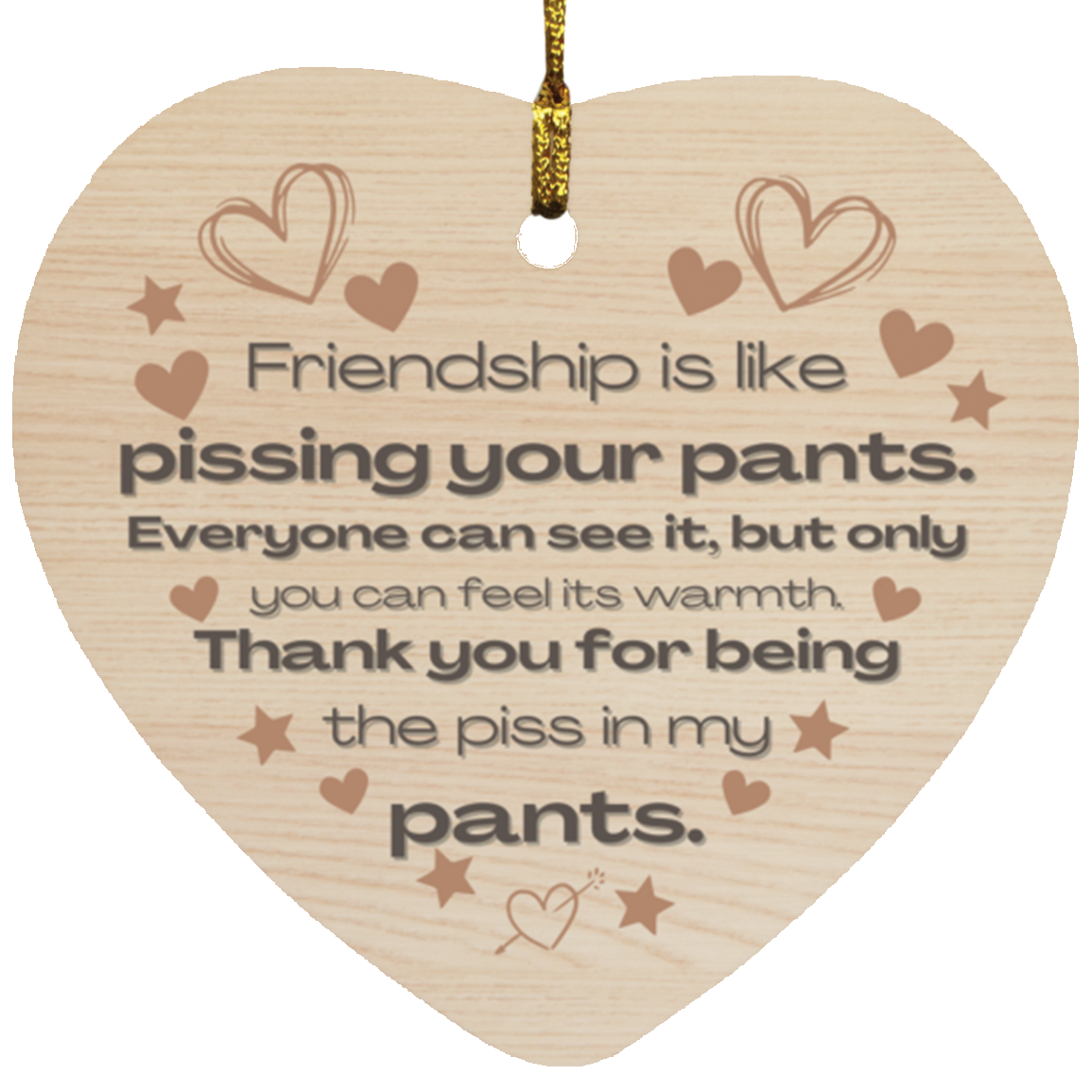 "Friendship is like pissing your pants. Everyone can see it, but only you can feel its warmth. Thank you for being the piss in my pants." š Let the candid humor of this ornament be a testament to the unfiltered, authentic connection you share with a friend who adds warmth and laughter to your journey.