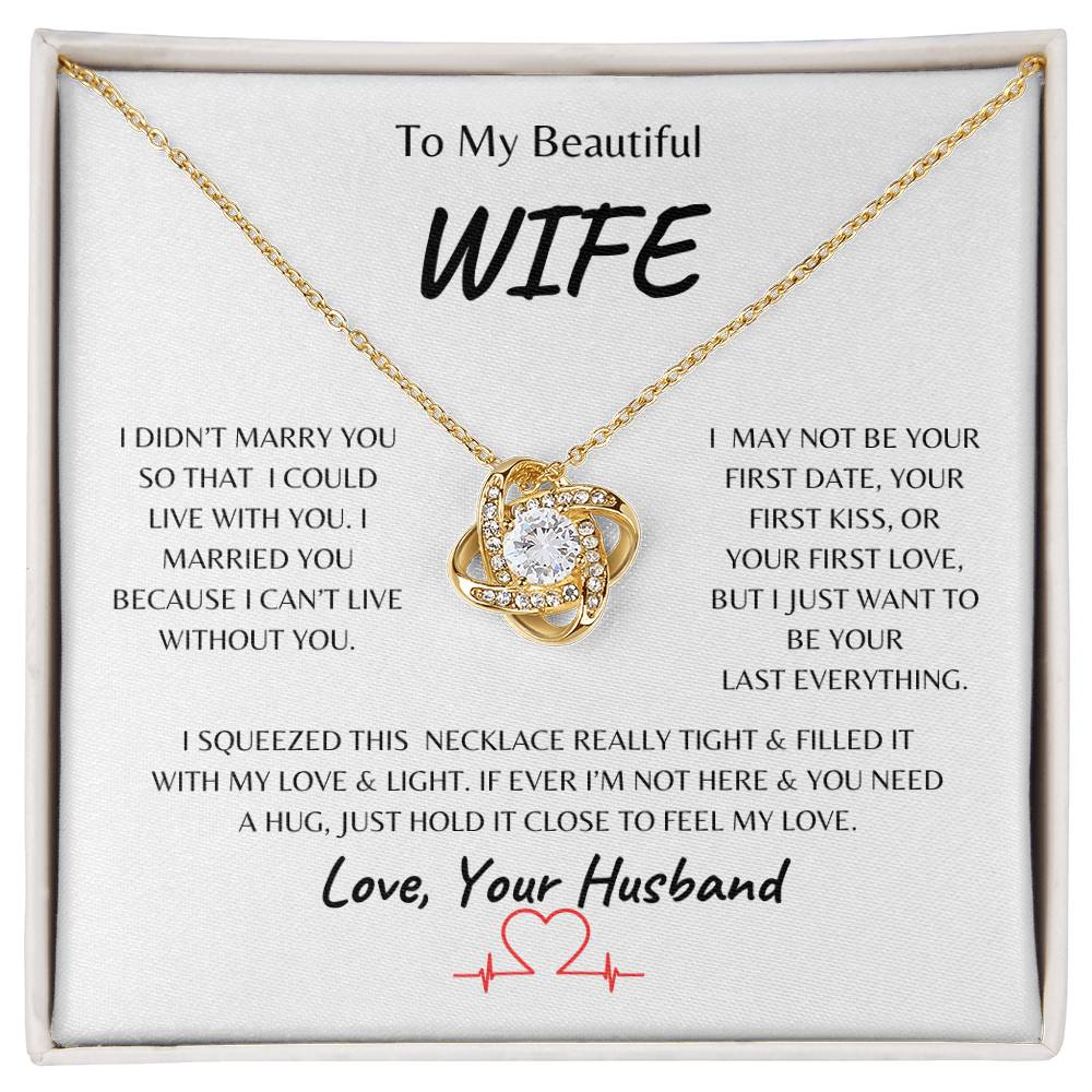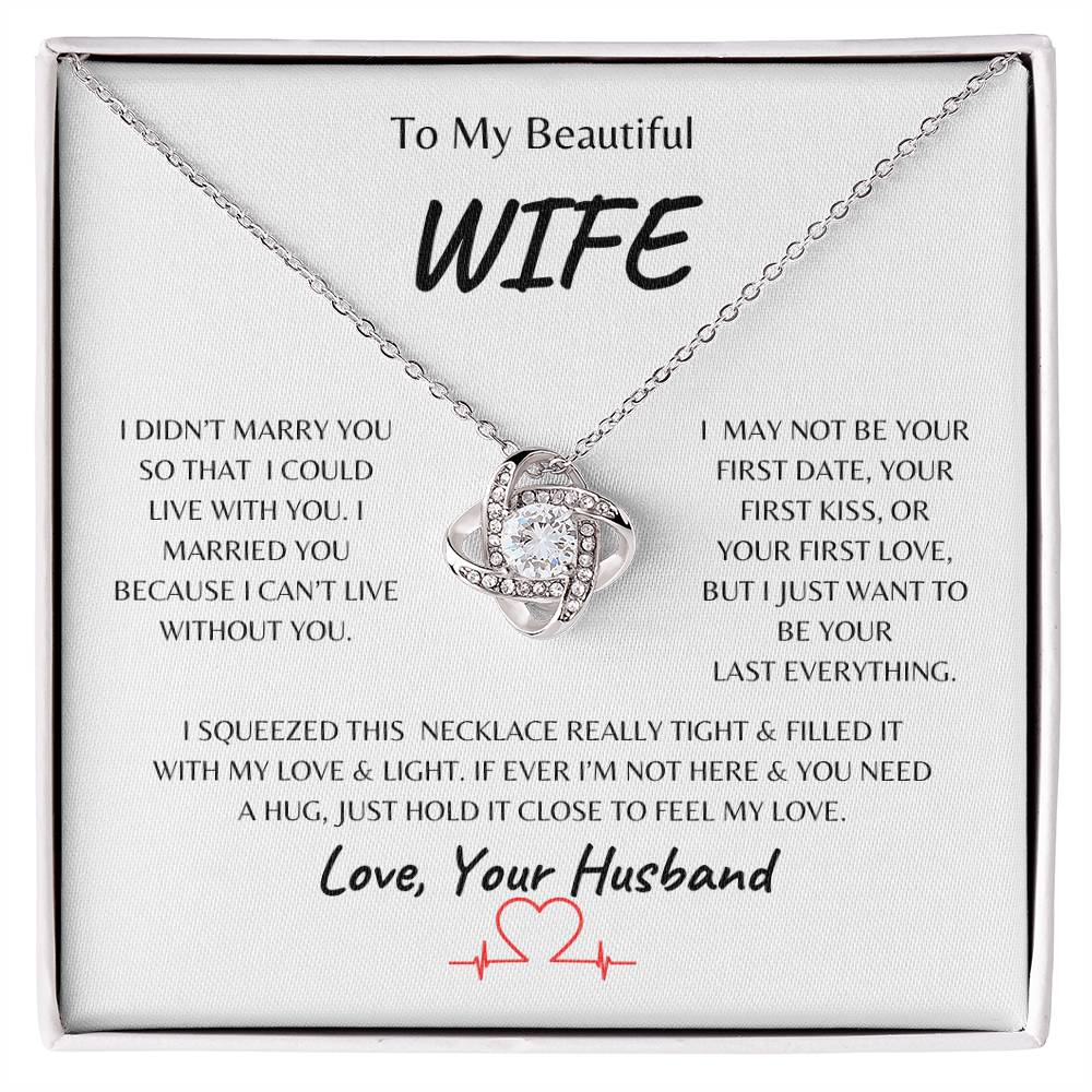 The accompanying message card, a love letter from your heart, adds a personal touch to this already enchanting necklace. "To my beautiful wife, I didn't marry you so that I could live with you, I married you because I can't live without you. I may not be your first date, your first kiss, or your first love, but I just want to be your last everything."